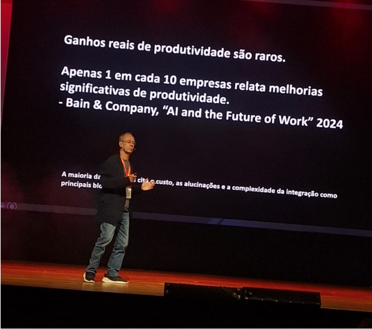 Em uma das palestras do IT Summit, nosso colega Cezar Taurion, um dos principais autores sobre IA do Brasil e palestrante focado em estratégia e transformação digital, apresentou um dado alarmante: apenas 1 em cada 10 empresas relata melhorias significativas de produtividade.